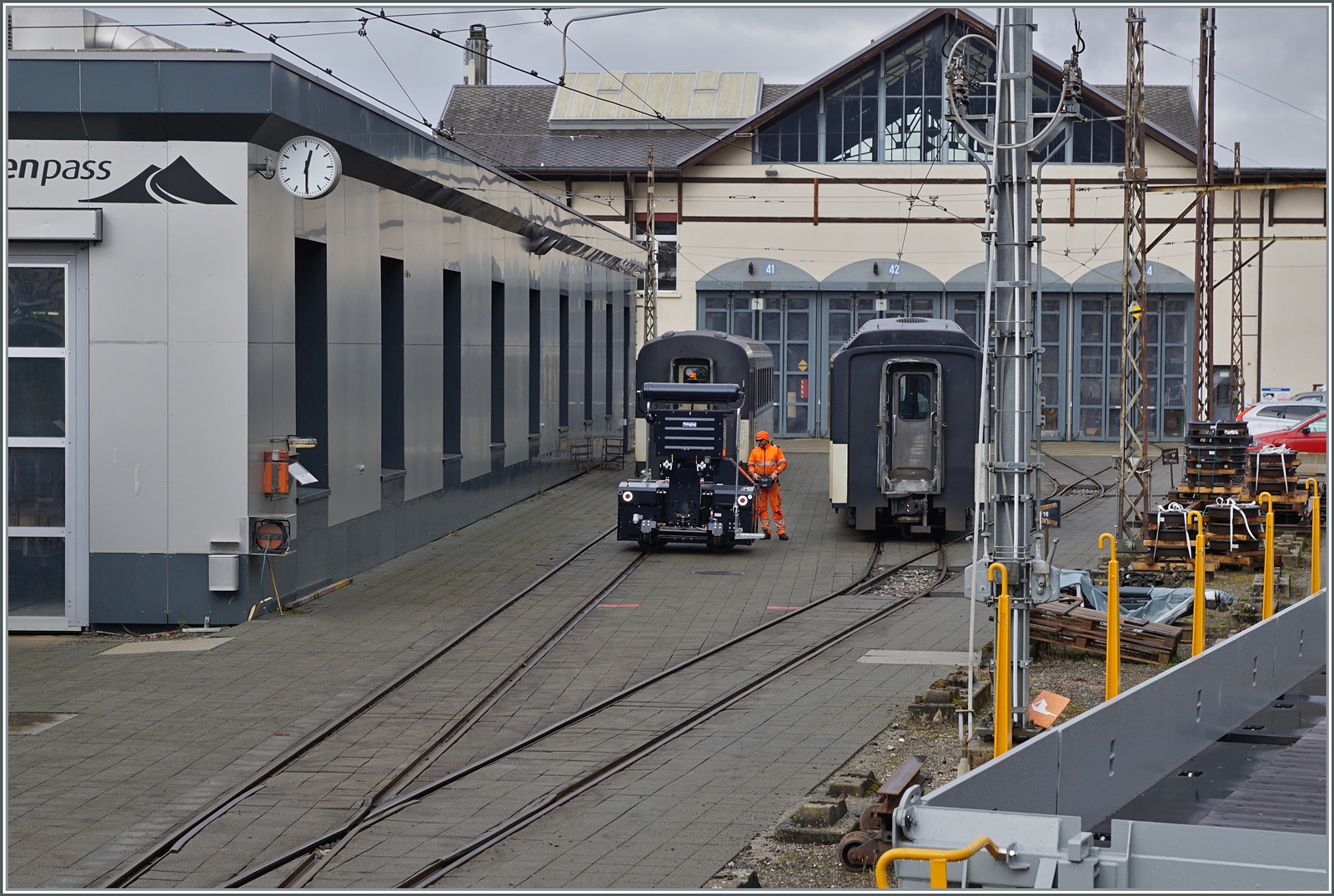 SPURWECHSEL bei der MOB - zu diesem Thema gehört auch der sichtlich neue ZAGRO E-MAXI (mit Batterieantrieb), welcher hier in Chernex beim Rangieren eines MOB Panorama Wagens zu sehen ist, selbst wenn dies auf diesem und den nächsten Bild noch nicht so plausibel erscheint. 20. Feb. 2026