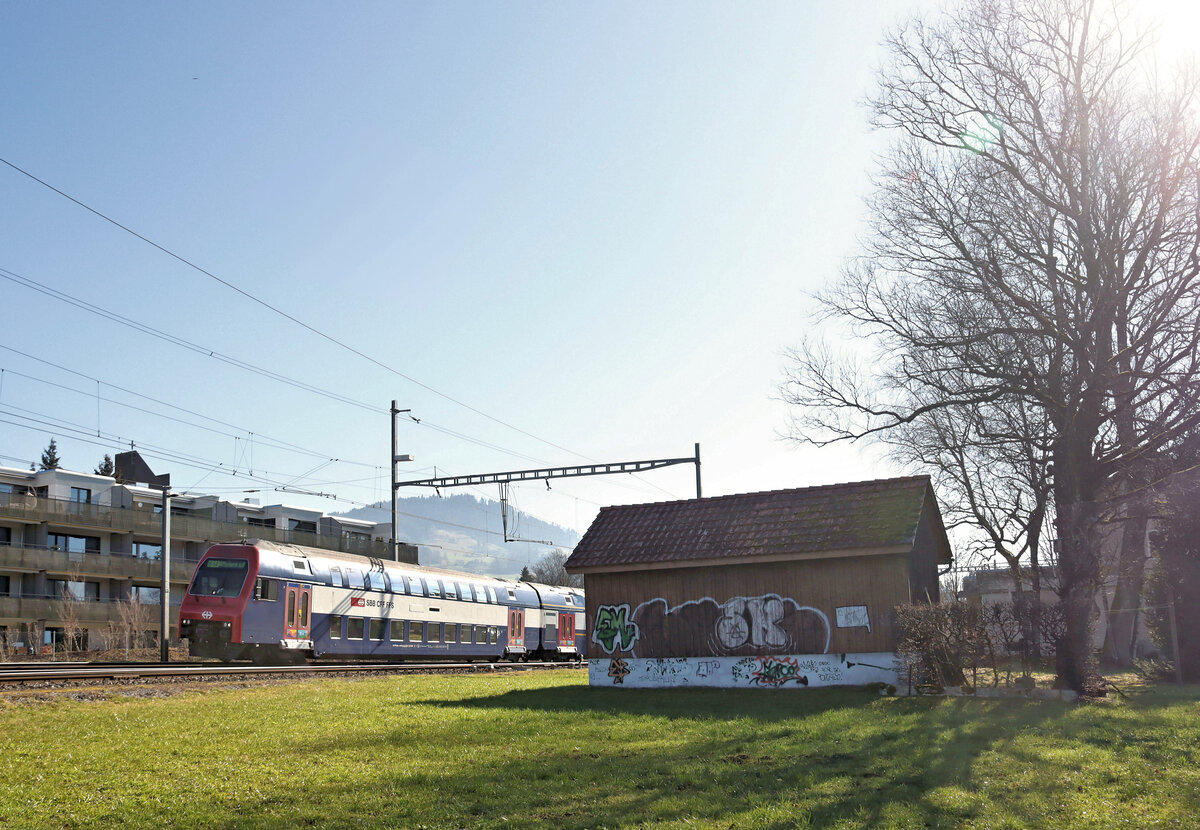 Die Kempttalbahn: Lok 450 053 stösst ihren S-Bahnzug nach Zürich Hardbrücke Richtung Pfäffikon ZH. Vor der Lok ein Doppelstockwagen Serie 26-73 aus der ab 2011 gebauten Serie von 113 Wagen "DPZ Plus" für die SBB. 5.März 2025