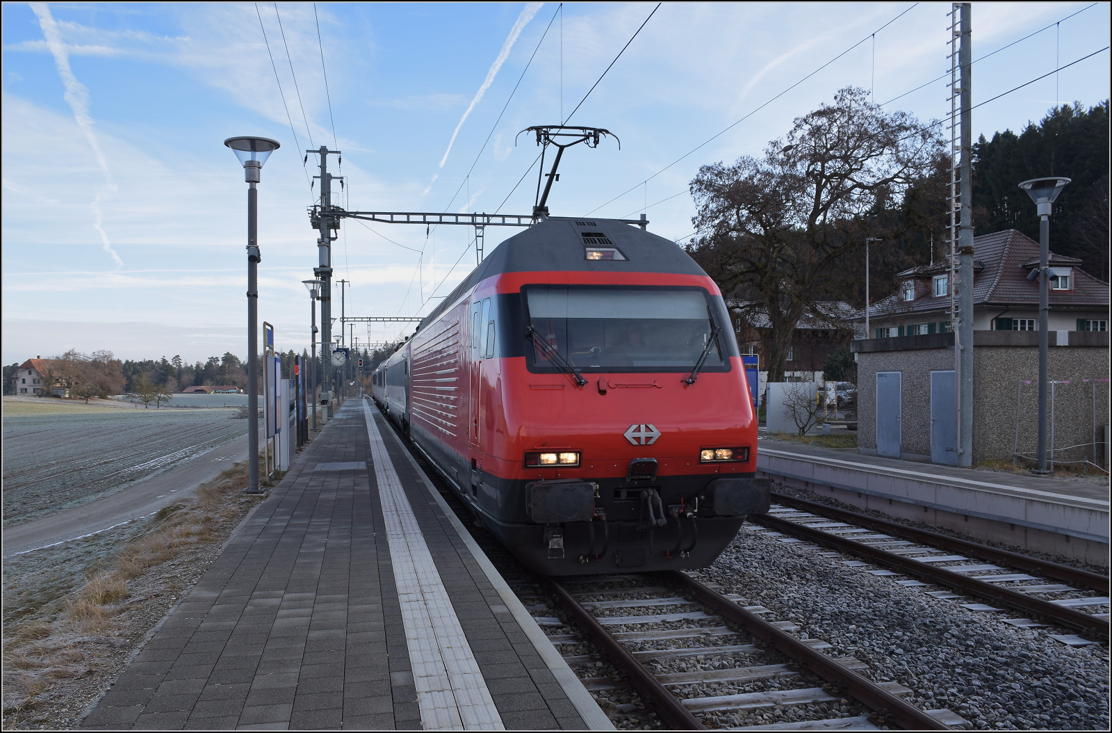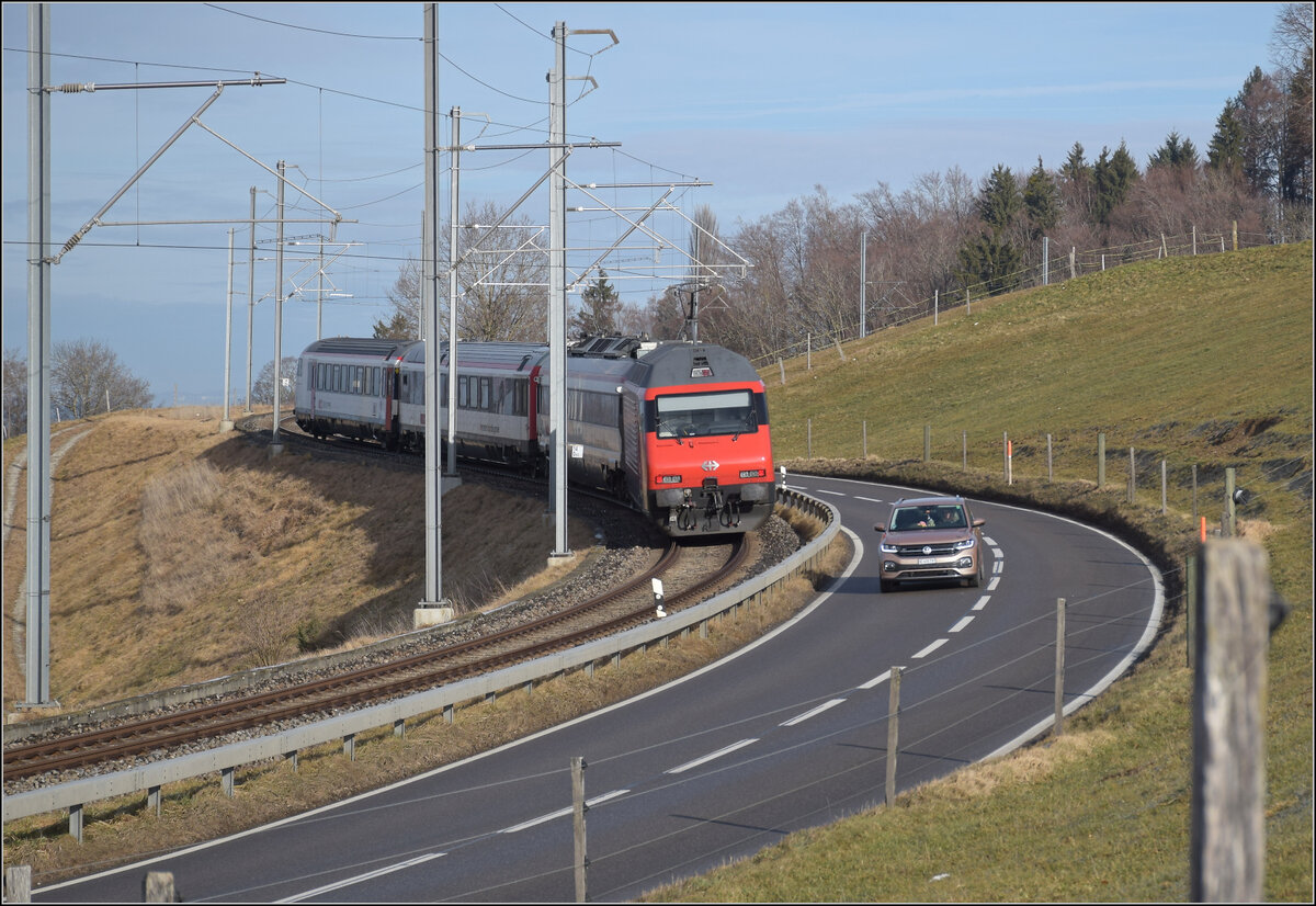 Zur Strafe für die Bemerkung langweilig schlich sich keine Minute später von hinten völlig unbemerkt direkt an uns diese Zugkomposition vorbei. Re 460 014 'Val de Trient', der Messtriebwagen XTmass 160 001, der Infrastrukturdiagnosewagen X 99 85 93-61 247-1 CH-SBBI und der IC-Steuerwagen Bt 50 85 28-94 918-5 CH-SBB. Diese Strafe ist wirklich annehmbar. Mittelhäusern, Januar 2026.