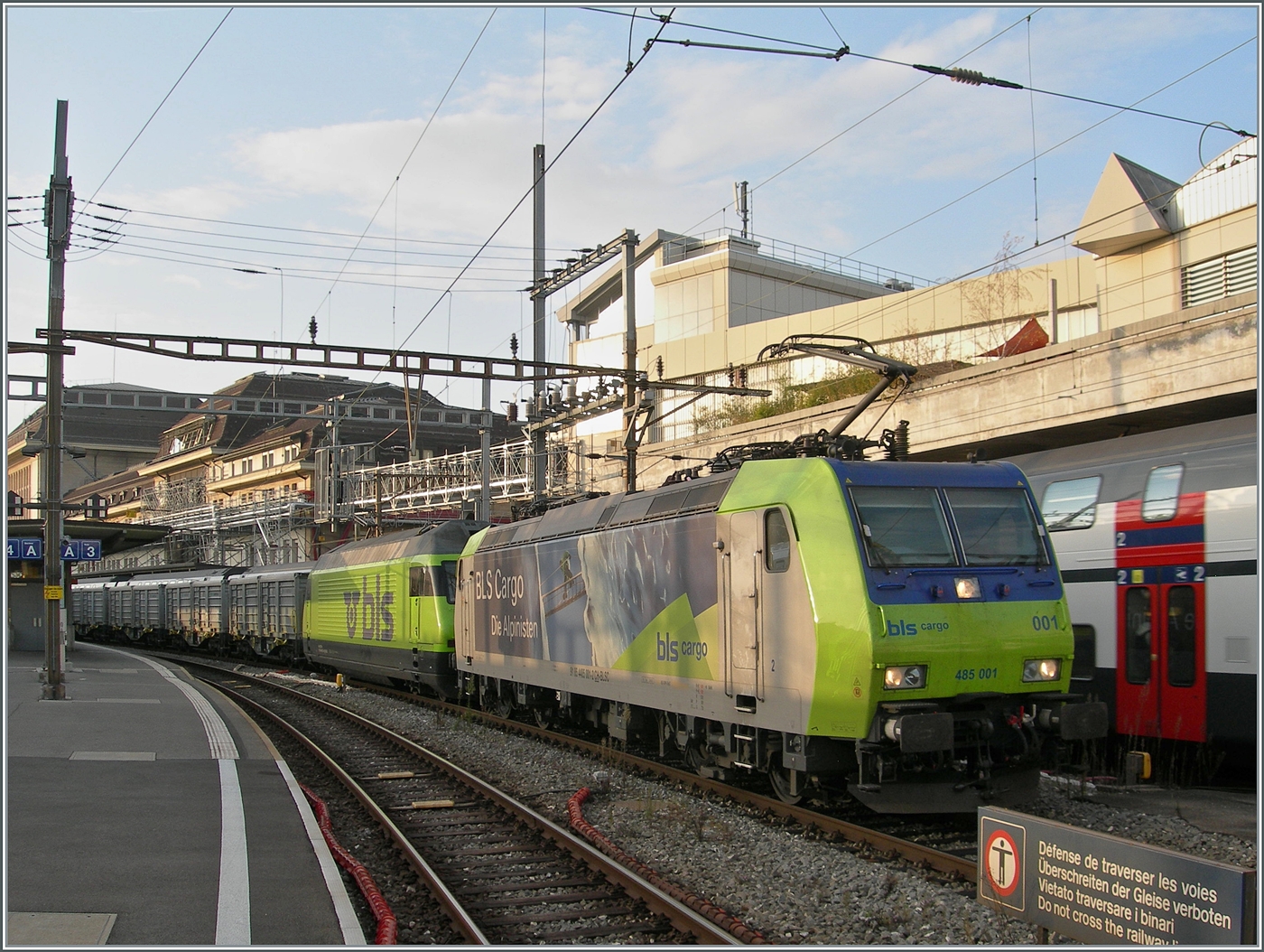 Die BLS Re 485 001 und BLS Re 465 014 sind mit einem Zuckerrübenzug unterwegs und warten in Lausanne auf die Blockdistanz zum vorausfahrenden IR 90.