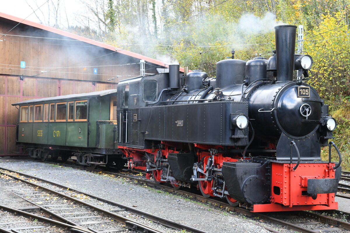 La DER de la Saison / Das Saison Ende der Blonay Chamby Bahn 2024 - Seit einigen Jahren zeigt die Blonay Chamby Bahn zu Saison Ende mit einem etwas verdichteten Fahrplan noch einmal ihrer herrlichen Fahrzeuge im Einsatz. Der RhB Bernina ABe 4/4 35 wartet in Blonay mit dem Riviera Belle Epoque auf den einfahrenden Gegenzug und die Abfahrt nach Chaulin.