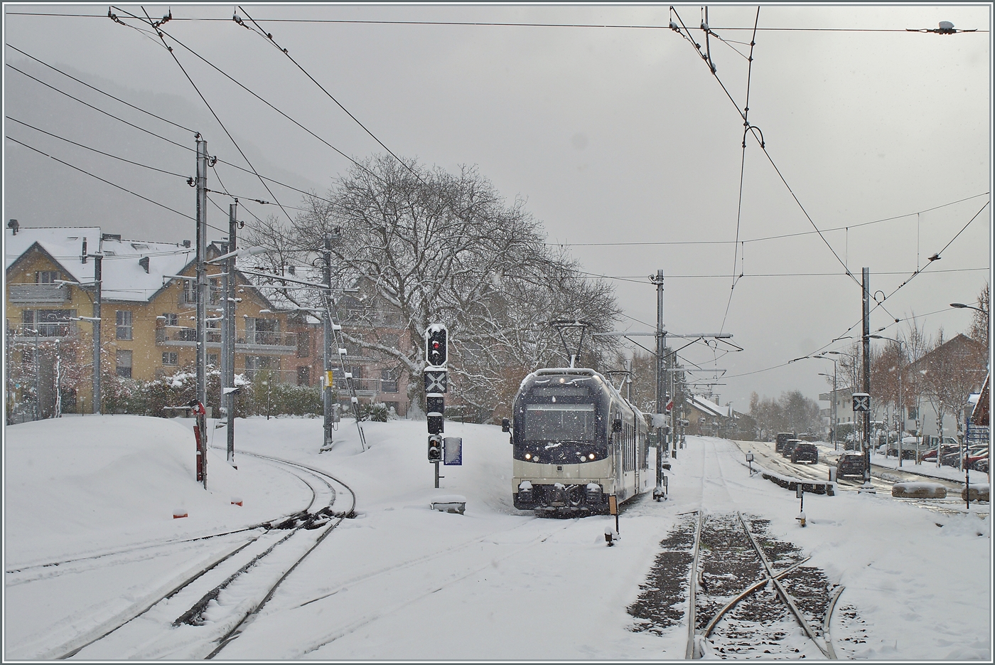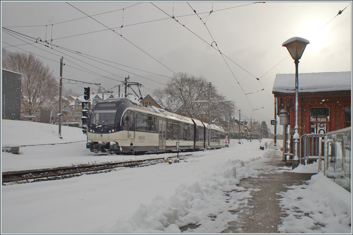 Während in Chamby der CEV MVR ABeh 2/6 7504 "Vevey" als R34 nach Montreux einfährt, versteckt sich hinter dem schön hergerichteten Empfangsgebäude auf Gleis 3 die HG 2/4 N° 3 der Blonay Chamby Bahn.
