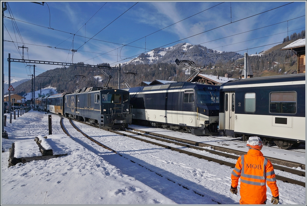 Der MOB ALPINA ABe 4/4 9303 (und die nicht zu sehende MOB Ge 4/4 8002) sind mit ihrem GoldenPass Belle Epoque PE 2219 bei Sendy-Sollard unterwegs.