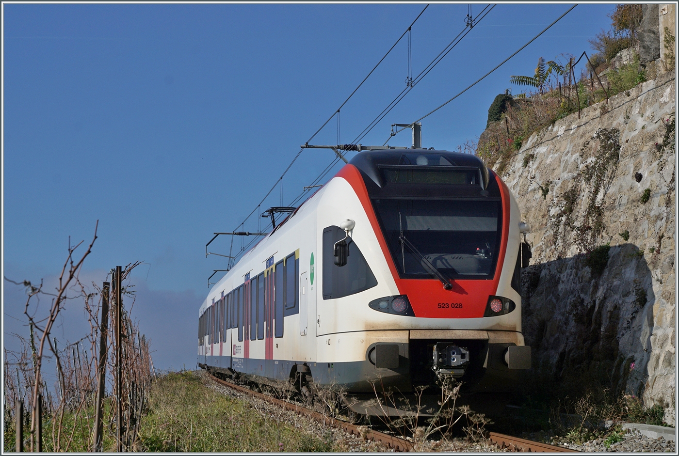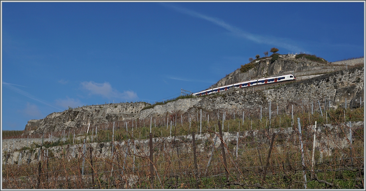 Trotz Fahrzeugmangel bei der PBr pendelt ein Travys Dominio als "Train des Vigens" zwischen Vevey und Puidoux - Chexbres, heute Vormittag, infolge Unterspühlung der Strecke Vevey - Lausanne bei Lutry sogar im Haldbstundentakt. Vevey,den 5. Mai 2015