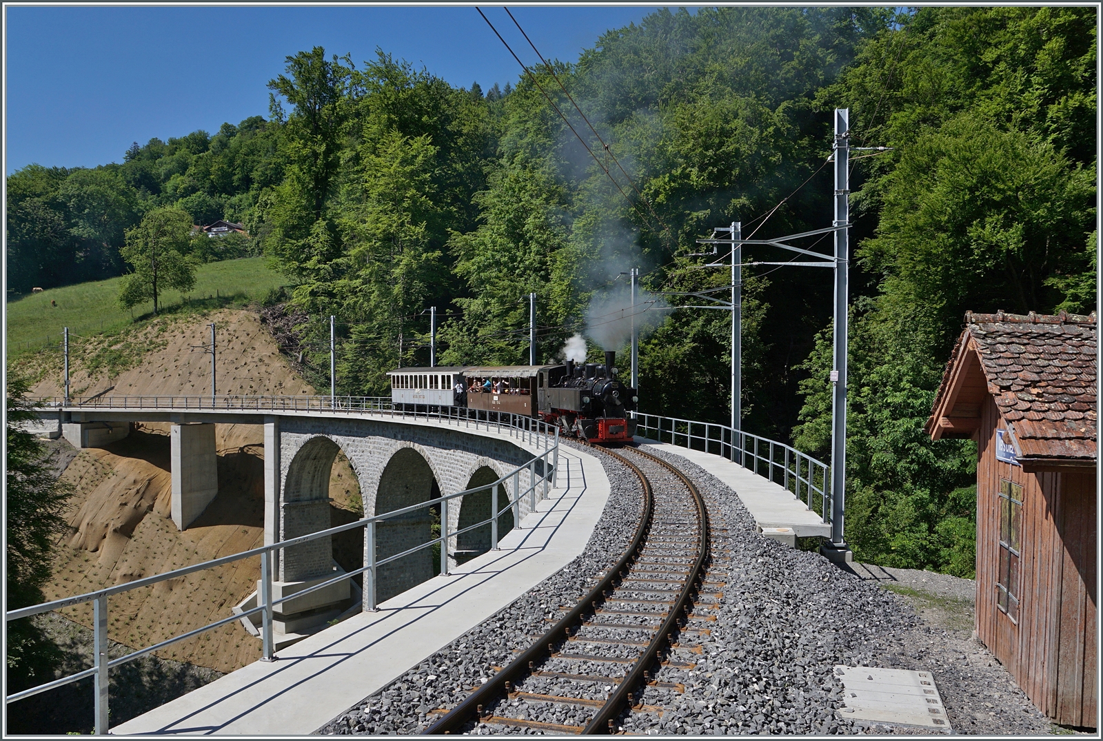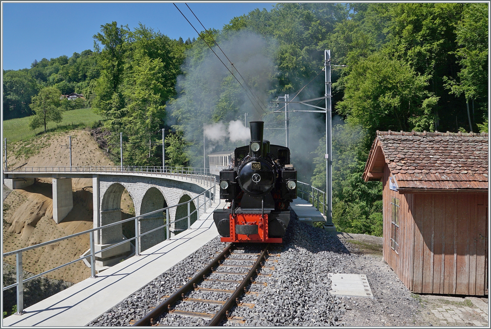 Kurz vor Chantemerle dampft die SEG G 2x 2/2 105 der Blonay Chamby Bahn mit ihrem kurzen Reisezug in Richtung Blonay.
