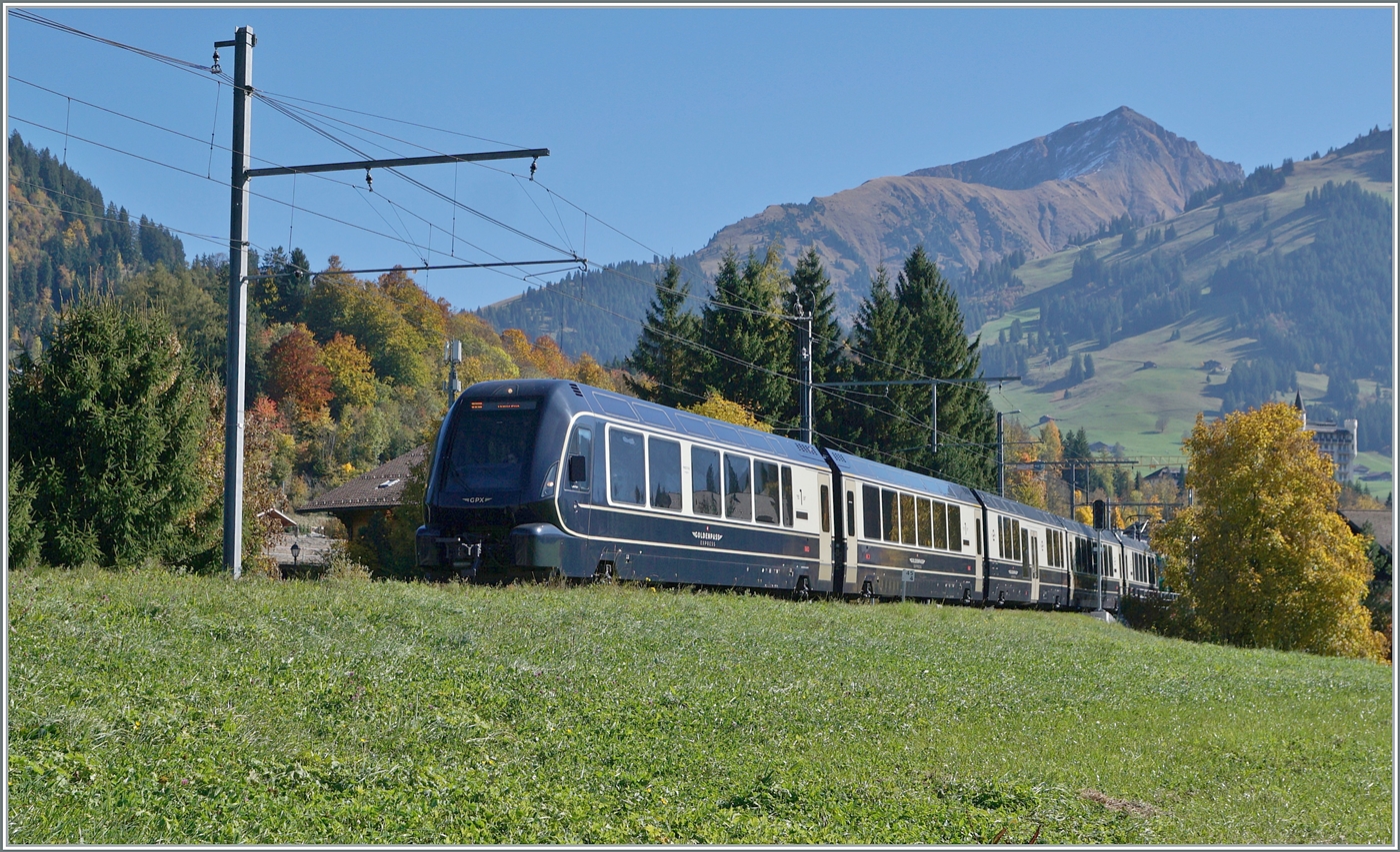Der MOB ABe 4/4 9303 und ein weiterer sind mit dem PE 30 GoldenPass Belle Epoque 2219 auf der Fahrt von Zweisimmen nach Montreux und überqueren die Grubenbachbrücke in Gstaad.