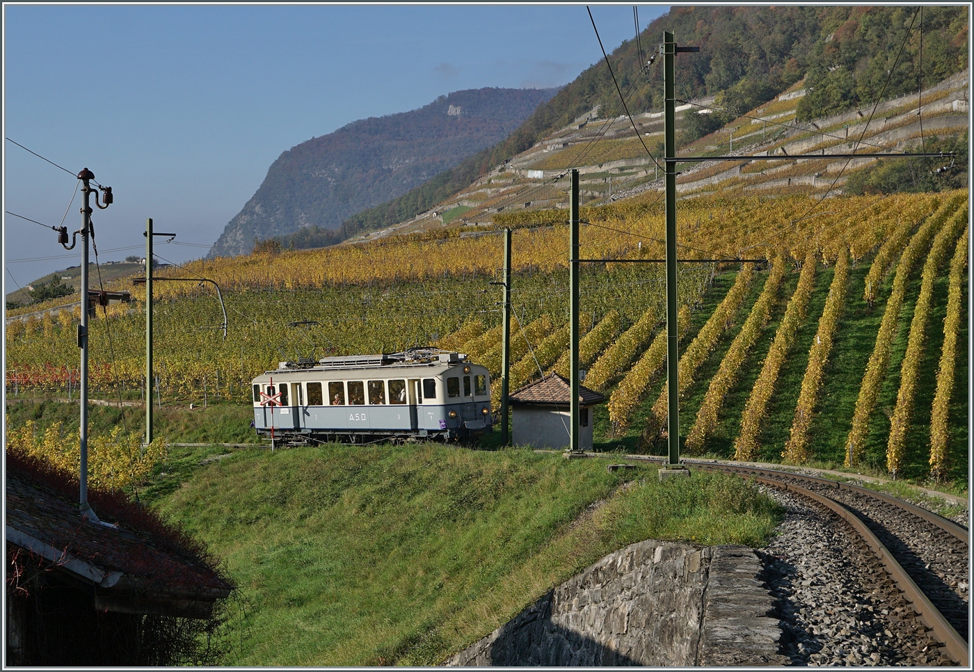 Am 2. November lud die  Association ASD 1914  mit ihrem ASD BCFe 4/4 N° 1  TransOrmonan  zu einer Jass-Fahrt ein. Das Bild zeigt den  Association ASD 1914   ASD BCFe 4/4 N° 1  TransOrmonan  oberhalb des Château d'Aigle auf der Fahrt in Richtung Les Diablerets.