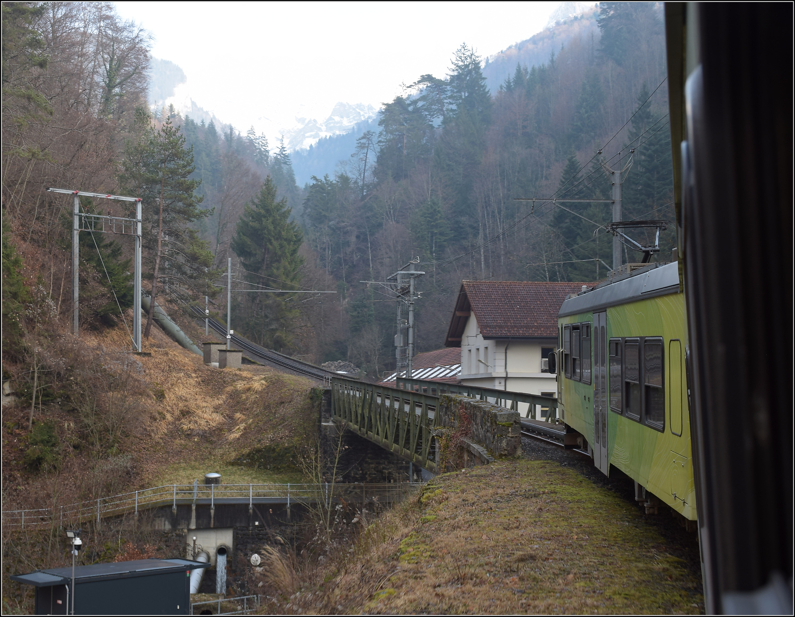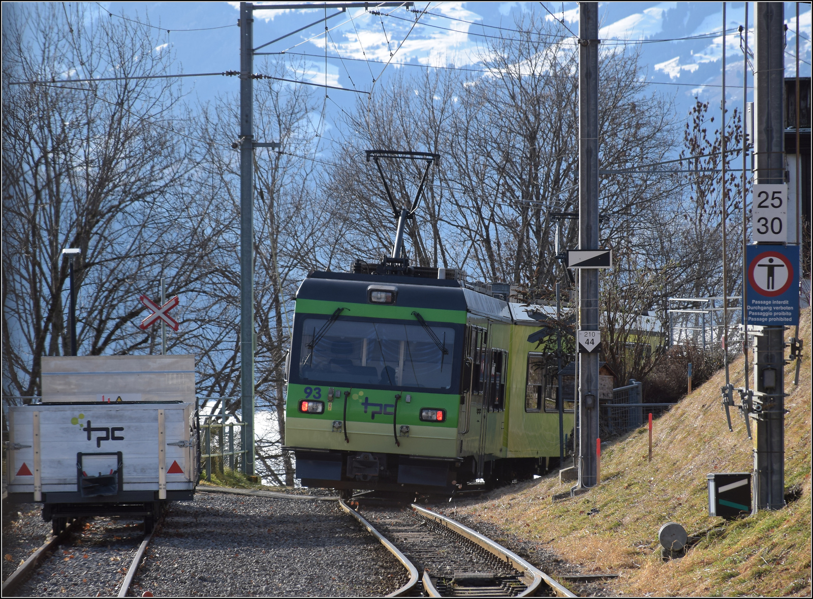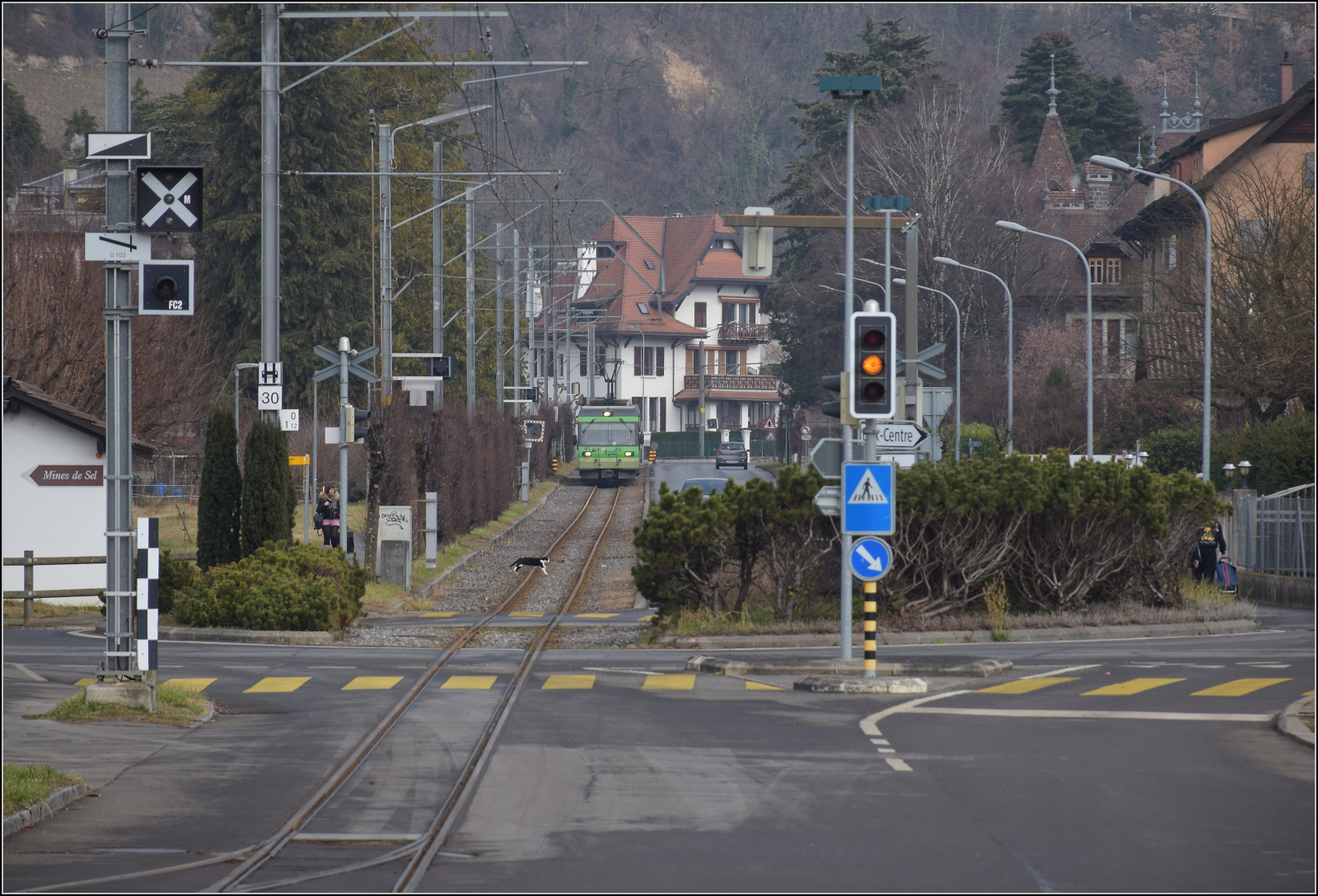 Irisch viele Schilder sind an einem Lampenmast in Gryon angebracht, davon sind immerhin zwei für die BVB bestimmt: die Züge 6 und 5 sowie 206 und 9 kreuzen sich in Gryon, und die Geschwindigkeit auf dem nun folgenden Abschnitt beträgt 20 km/h.