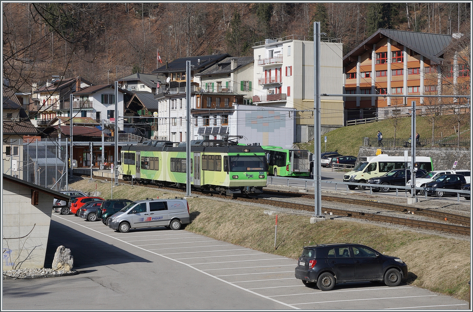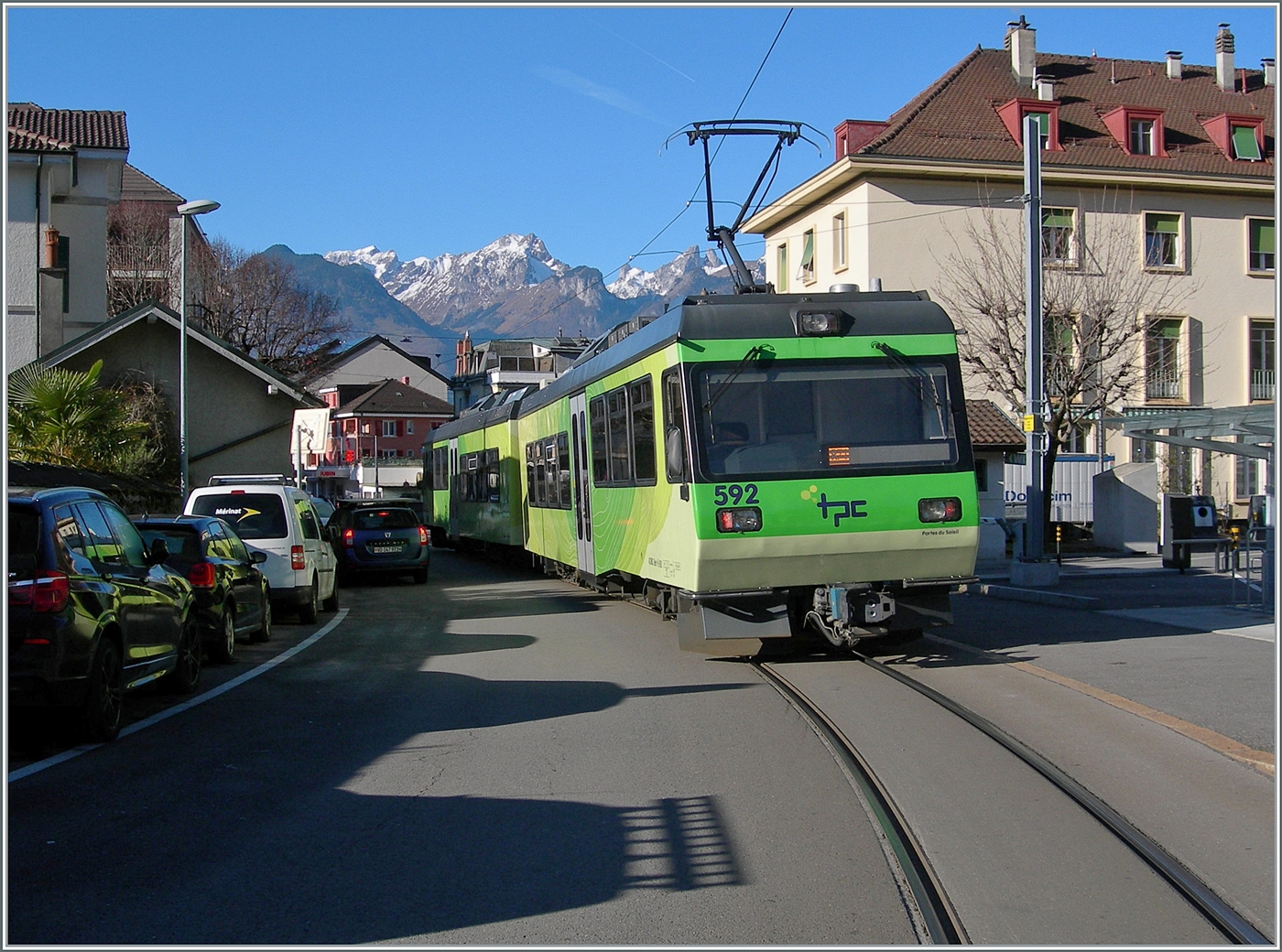 Kurz darauf kommt aus der Gegenrichtung der TPC AOMC ASD Beh 4/8 591 angefahren, der als R71 436 auf dem Weg nach Les Diablerets ist und kurz nach der Haltstelle Aigle Place du Marché unter einem alten Fahrleitungsmasten festgehalten wurde.