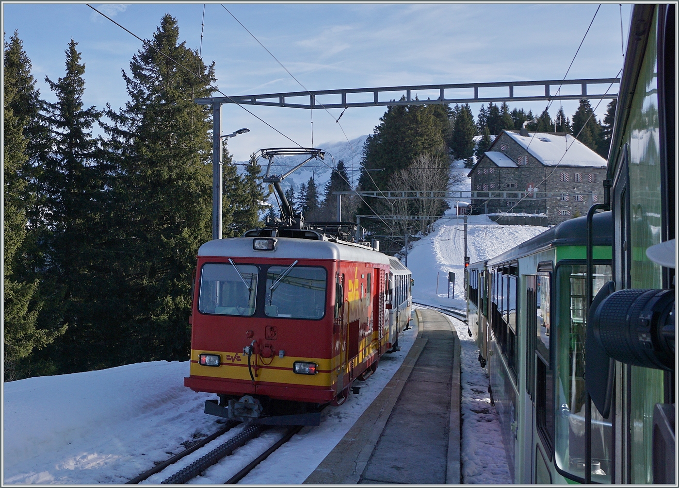 Ich dachte, die TPC BVB HGe 4/4 sei nicht mehr in Betrieb, um so mehr freute ich mich, als mir auf der Fahrt in Richtung Col-de-Bretaye in Bouquetins die BVB HGe 4/4 32 entgegen kam und mich eines besseren belehrte. 19. Januar 2026