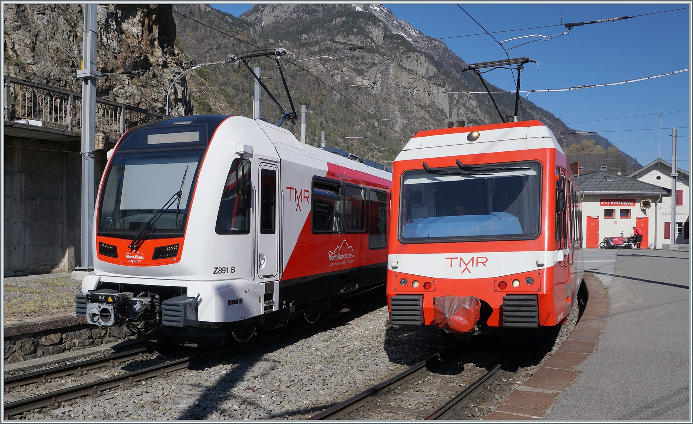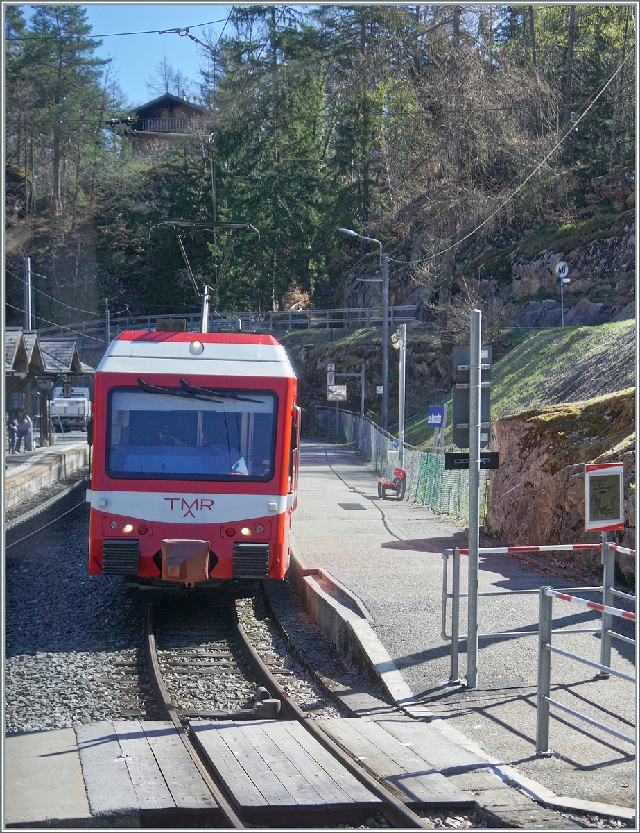 Der TMR MC BDeh 4/4 N° 8 (TSI Nr: 90 85 838 0008-5) von Martigny kommend bei der Durchfahrt an der ehemaligen Haltestelle La Bâtiaz (EH). Von der Eröffnung 1906 bis 1931 verkehrten die Züge statt auf dem direkten Weg zum SBB Bahnhof über die Stadt Martigny welche damals damit eine Trambahn hatte. 18. Nov. 2018