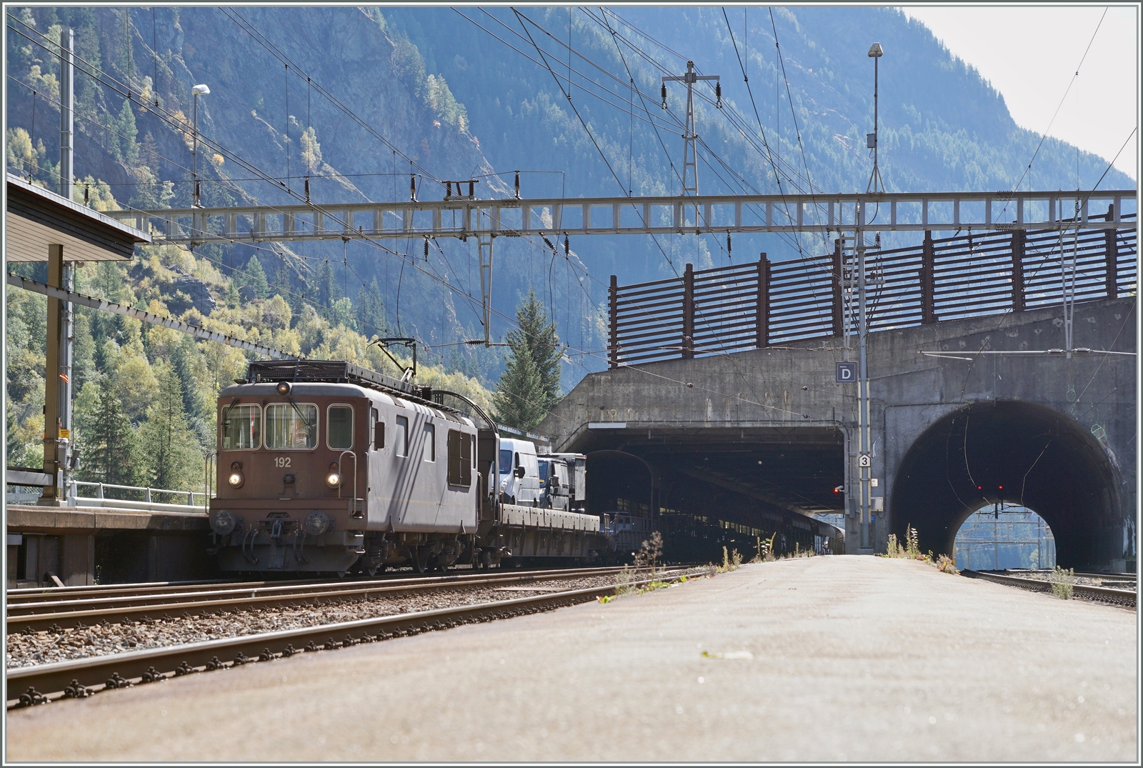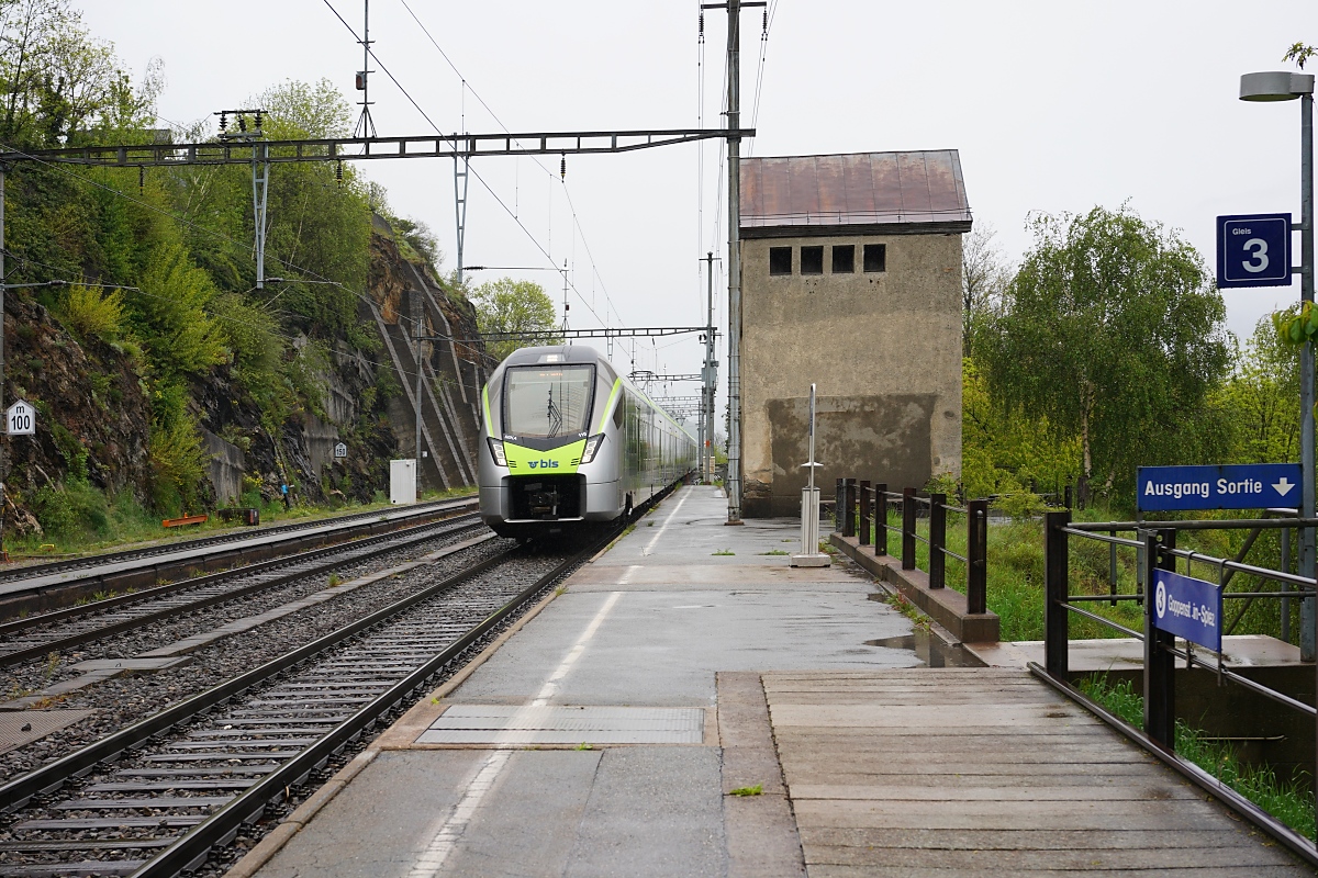 Nach der Eröffnung des LBT und vor der (verspäteten) Ablieferung der "Lötschberger" besorgten kurzzeitig Re 4/4 II mit EW III den RE Verkehr von Brig nach Spiez. Hier trifft ein solcher RE von Spiez kommend in Lalden ein.