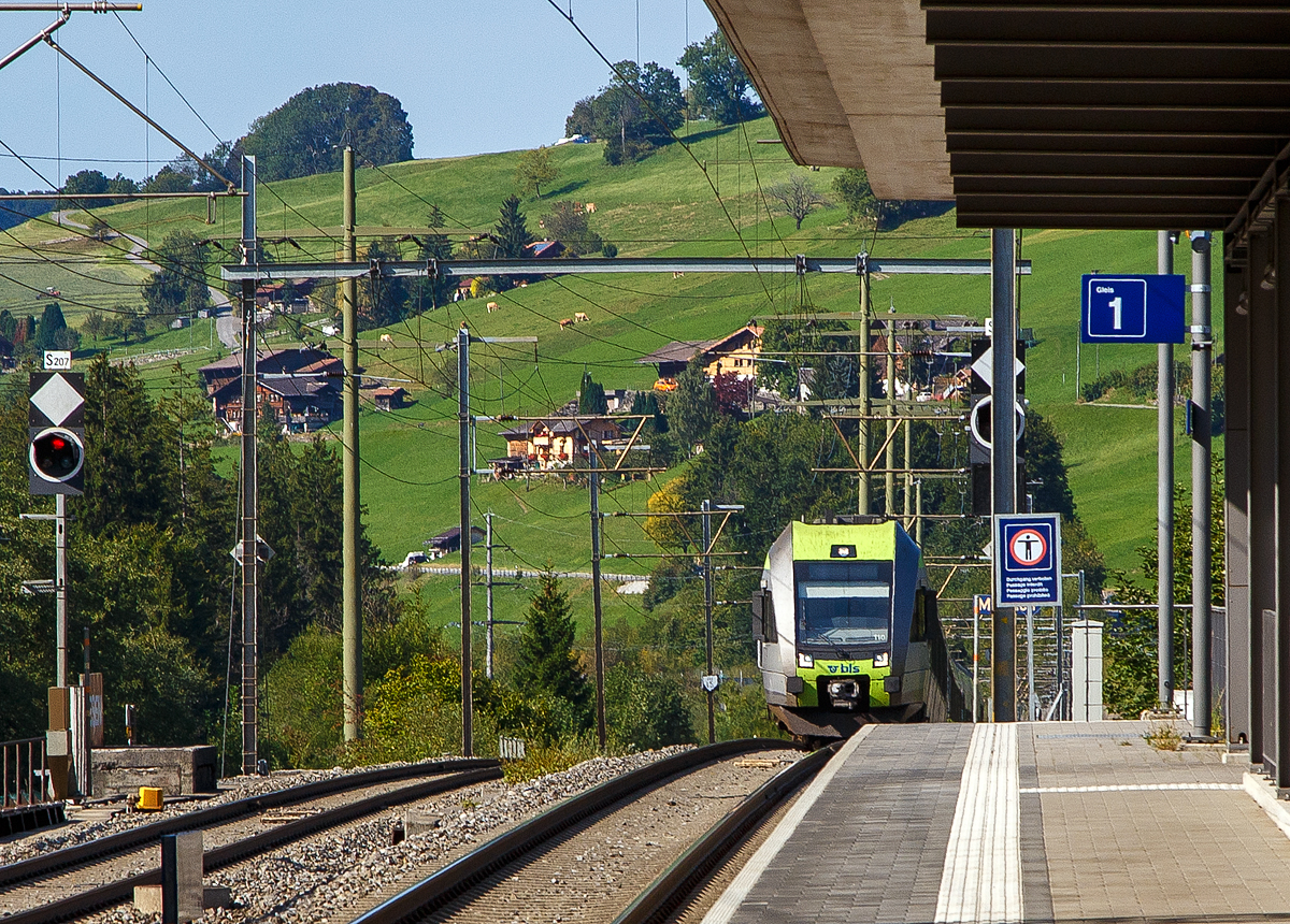 Die BLS Re 465 002 hat mit ihrem EW III Regionazug von Frutigen nach Spiez den Halt Mülenen erreicht.