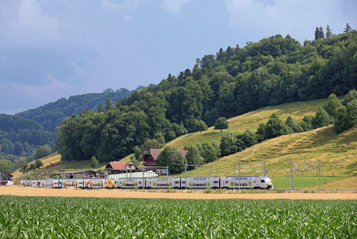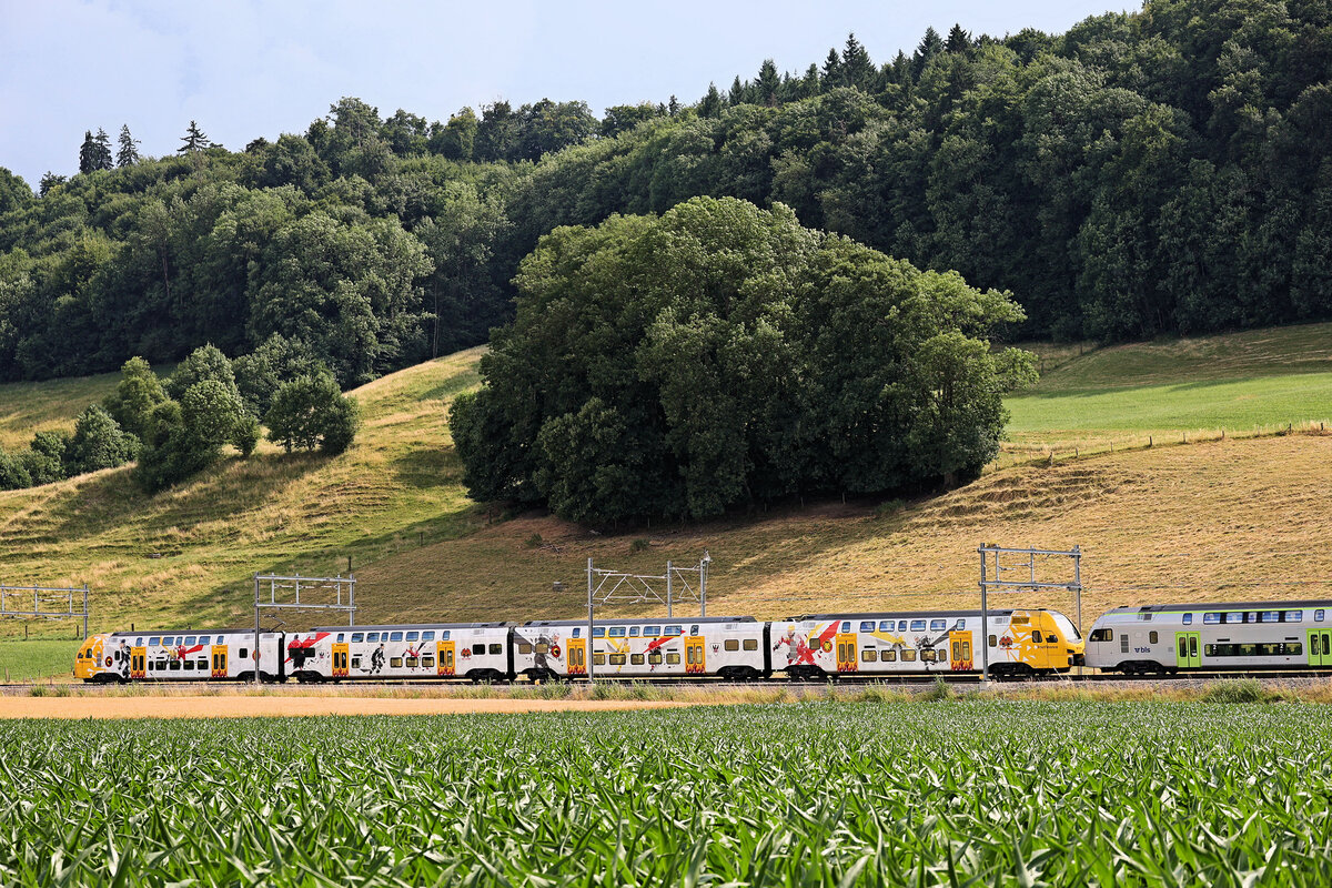 An der Rampe nach Uetendorf hinunter (Gürbetalbahn): Längere Zeit wurden einige Kurse der S4 mit den neuen MIKA 528 100 gefahren; jetzt sind besondere S-Bahn-MIKA (528 200, mit dem "S"-Zeichen) auch im Einsatz, hier 528 201 oder 202. 8.August 2023