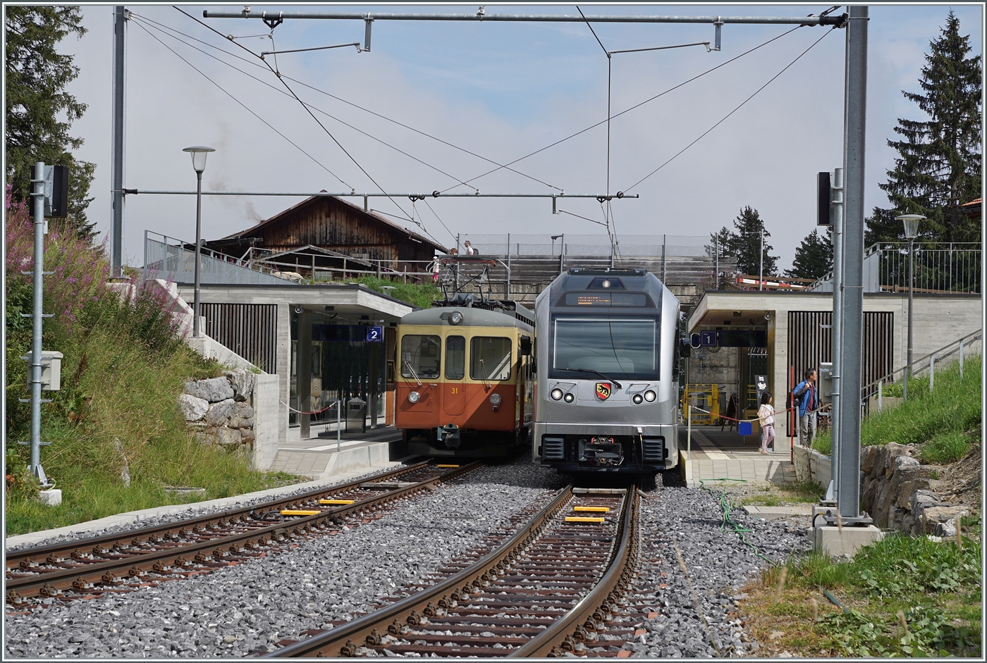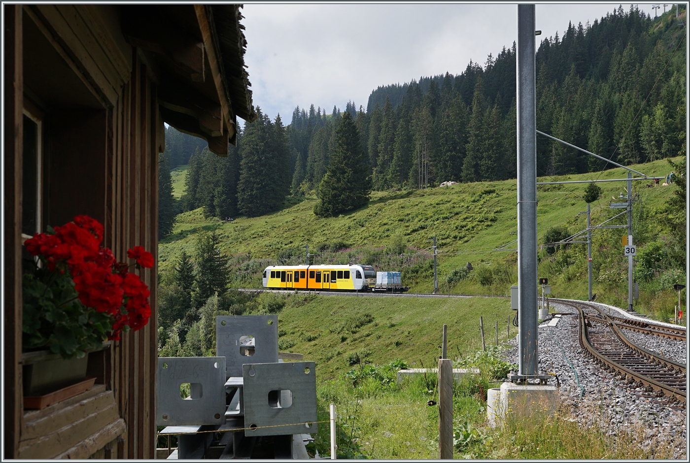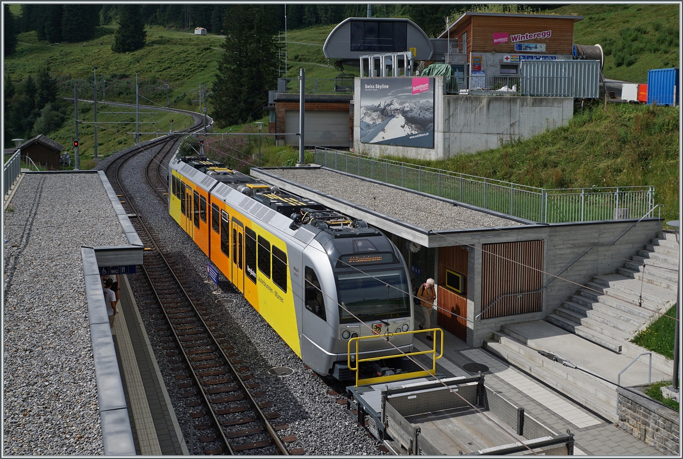 Der BLM Be 4/4 N° 31 "LISI" erreicht auf der Fahrt von Mürren nach Grütschalp den Bahnhof Winteregg, wo der Gegenzug in Form eines neune Be 4/6 bereits eintrifft.