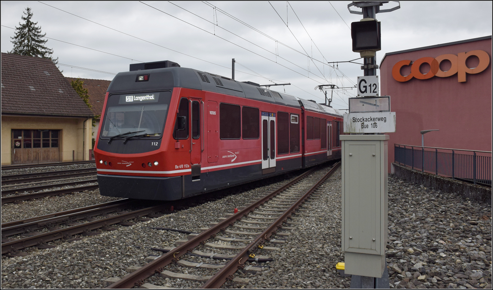 OeBB/ASm: Durch die Verlängerung der ASm-Strecke nach Oensingen hat auch der Bahnhof Oensingen eine Aufwertung erfahren. Züge nach Balsthal (Güterzug mit Re 4/4 l 10009) sowie Reginalzüge nach Langenthal und Solothurn mit den Be 4/8 112 und Be 4/8 113 "STAR" in Oensingen am 13. Oktober 2014.