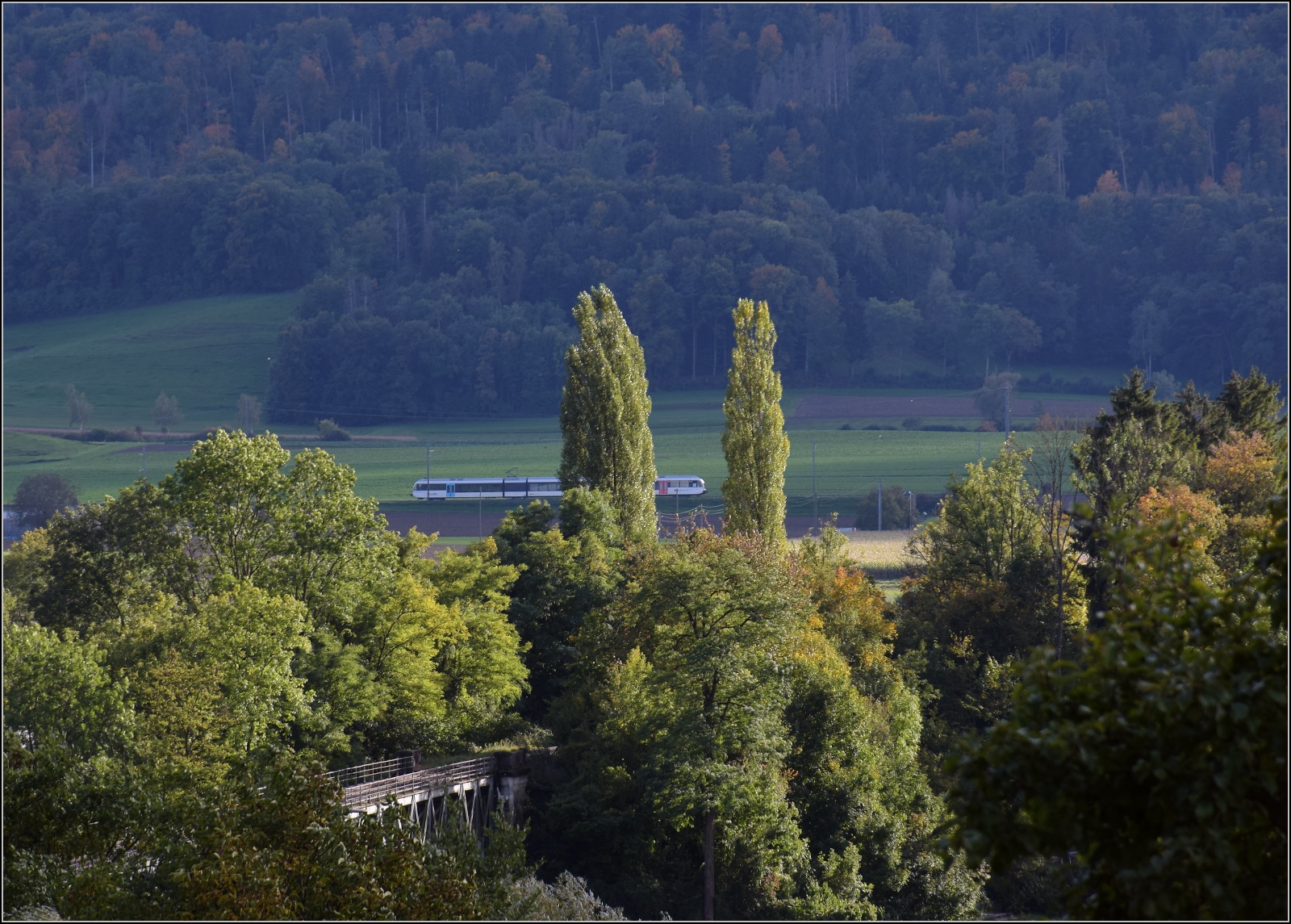 Schienenverkehr am Schienerberg. Ein GTW der Thurbo zieht hinter der Rheinbrücke von Hemishofen auf der Seelinie vorbei. Die Seelinie besteht aus vier geschichtlich verschiedenen Teilen. Dabei gabelte sich die Linie von Winterthur in Etzwilen weiter nach Singen und Kreuzlingen (Hafen). Die Strecken wurden seinerzeit am gleichen Tag von der Schweizer Nationalbahn eröffnet. Oktober 2022.