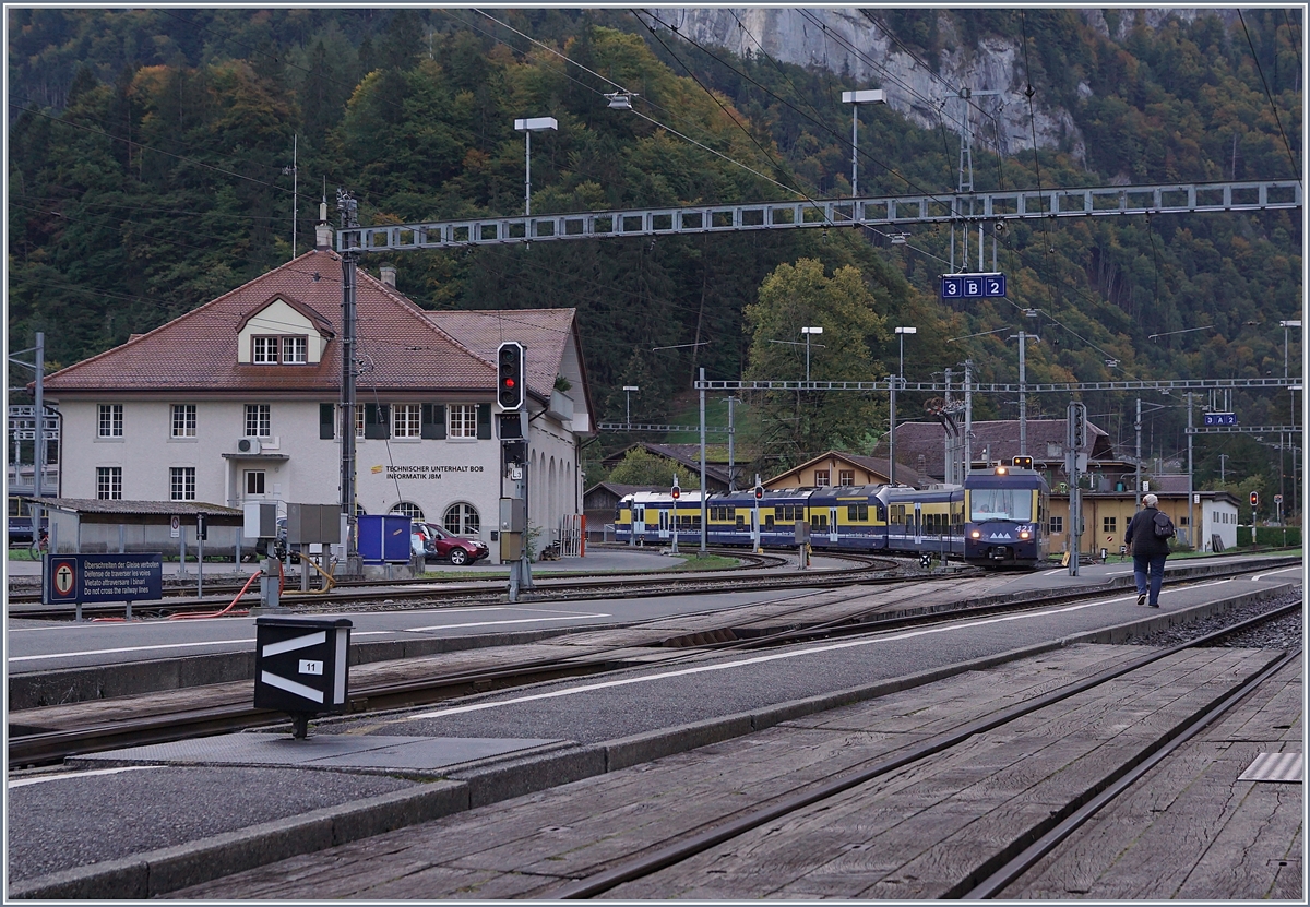 Ein BOB Zug aus Grindelwald erreicht Zweilütschinen. Links im Bild ist die wichtige Weiche 11 zu sehen. Der Zug aus Grindelwald wird unmittelbar nach der Weiche zum Stehen kommen und kurz darauf mit dem von Lauterbrunnen eintreffenden Zug vereinigt werden, in der Gegenrichtung wird hier entsprechend geflügelt; und dies im Halbstundentakt. 10. Okt. 2018