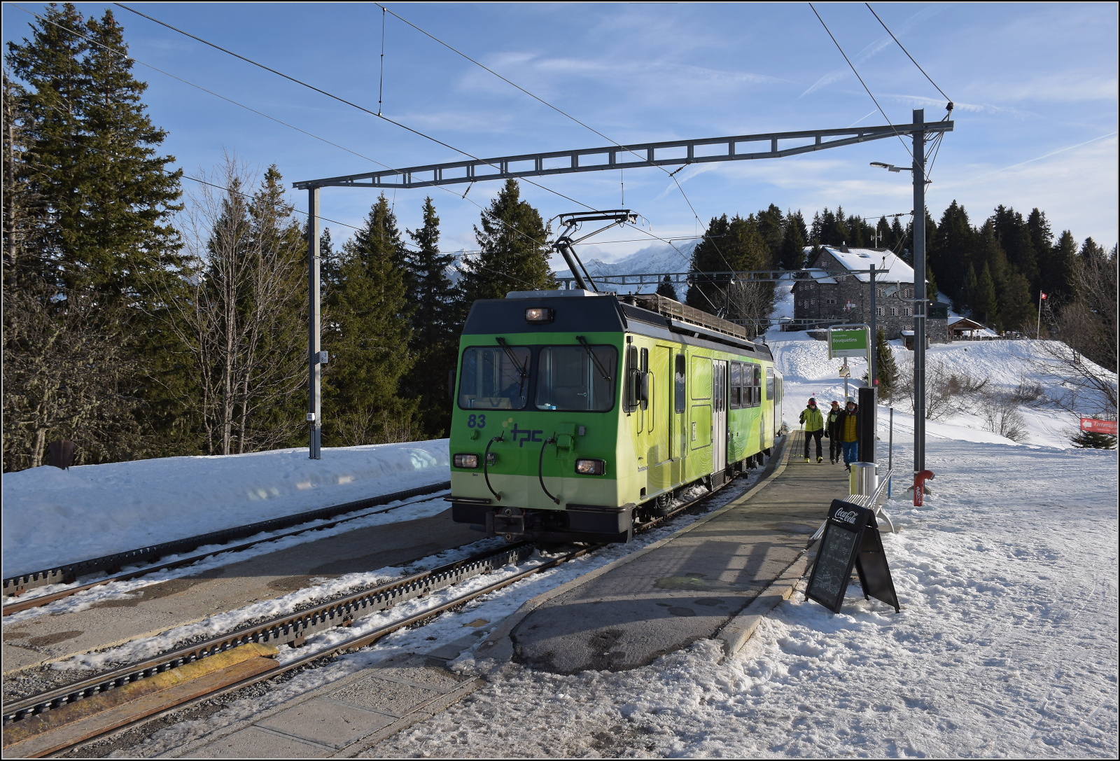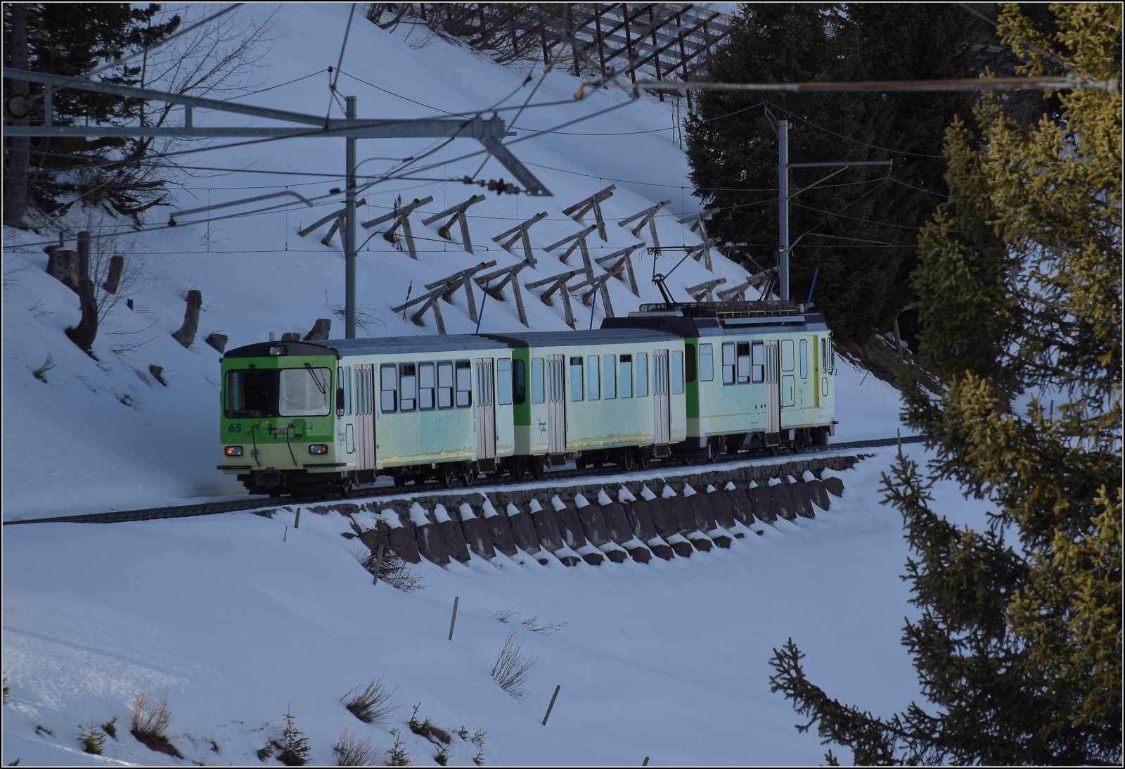 Der tpc BVB BDeh 4/4 – 81 „Gryon“ ein elektrischer Personentriebwagen mit Gepäckabteil für den gemischtem Adhäsions- und Zahnradbetrieb der Bex–Villars–Bretaye-Bahn, fährt am 10 September 2023 vom Bergbahnhof Col-de-Bretaye (1.808 m ü. M.) nun wieder hinab nach Villars-sur-Ollon. Vor dem Triebwagen sind die beiden Steuerwagen tpc BVB Bt 61(ex BVB B 53) und der Steuerwagen tpc BVB Bt 63.