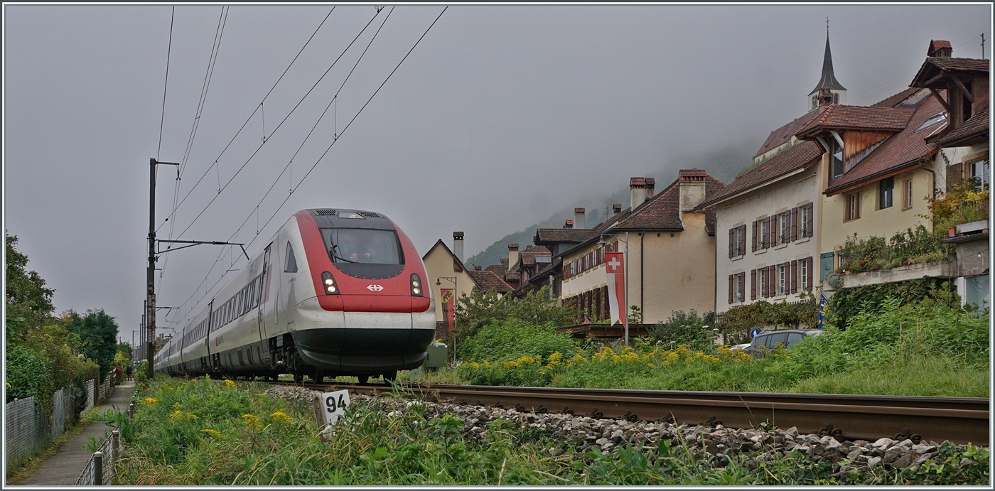 Der IC5 1521, bestehend aus den beiden SBB ICN RABDe 500 023"Charles Ferdinand Ramuz" (Spitze) und RABDe 500 018 "Adolf Wölfli" (Schluss) fährt mit hoher Geschwindigkeit durch den Bahnhof von Concise. Der IC 5 1521 ist auf dem Weg von Lausanne nach Zürich HB. 5. Juli 2025