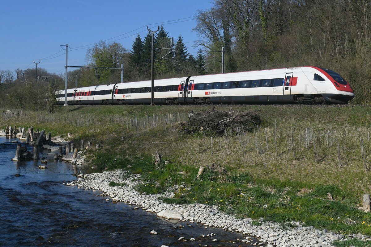 SBB:IC Lausanne-Zürich mit einem RABDe 500 (ICN) bei Twann am Bielersee auf dem einspurigen Streckenabschnitt am 10. April 2016.