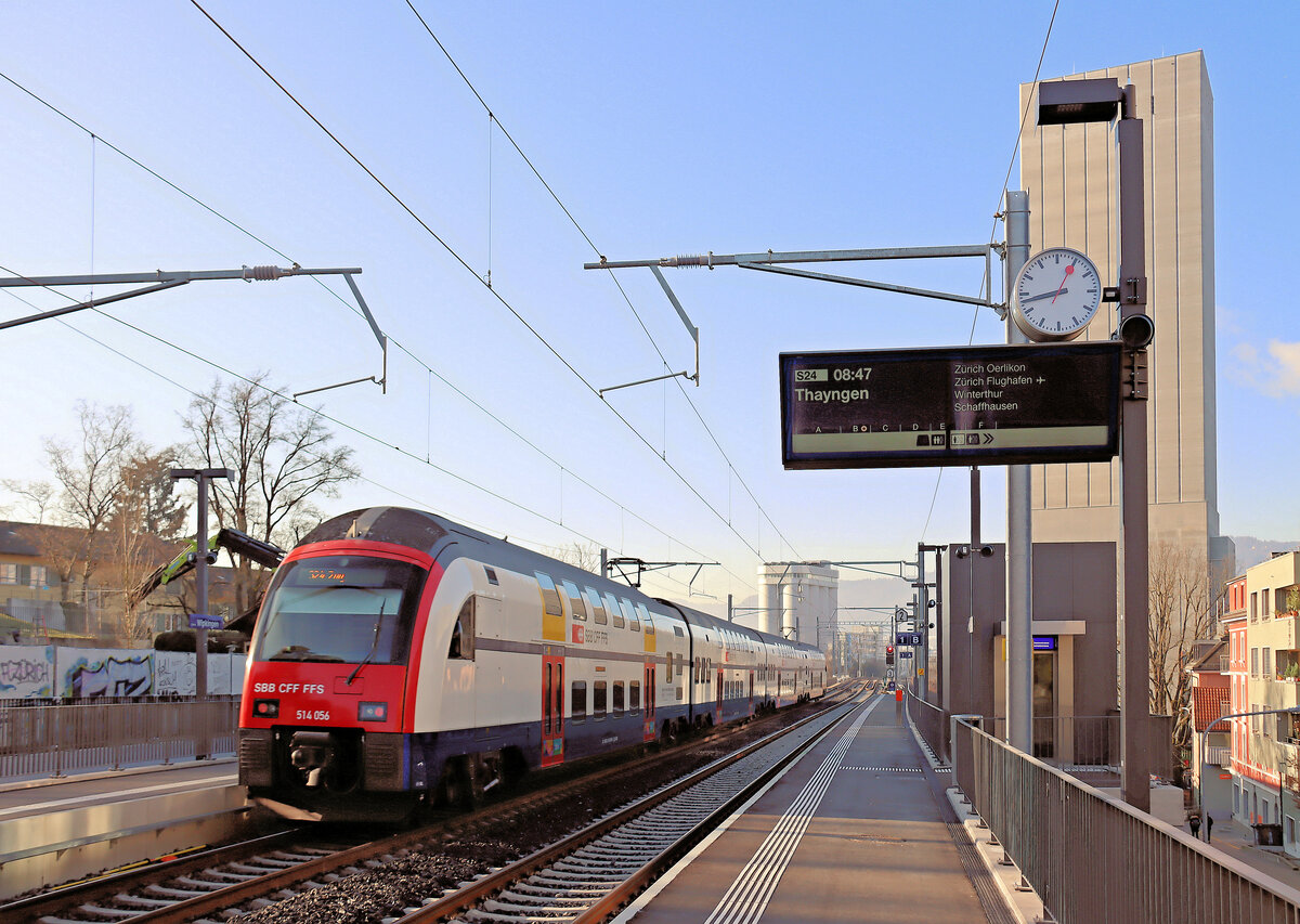 Der Bahnhof Wipkingen: Zwischen Zürich und Oerlikon gibt es drei Routen, diejenige durch Wipkingen ist die  klassische , dann gibt es diejenige durch den Käferberg via Hardbrücke, und die direkte Linie durch den unterirdischen Durchgangsbahnhof Zürich (bekannt als Zürich Löwenstrasse). Hier fährt ein S-Bahnzug der S24 nach Weinfelden aus Wipkingen aus. Triebzug 514 024. 5.März 2025
