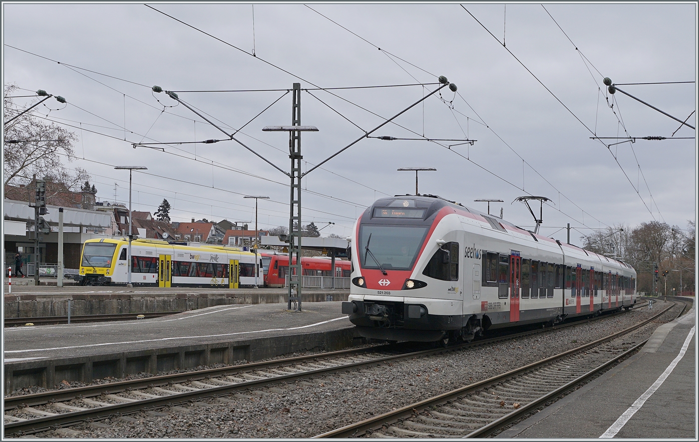 Nur ein bisschen im Hegau zuhause ist der Basler Flirt mit dem Herzchen. Manche nennen ihn auch den Wiesentäler, weil diese Züge extra für das Wiesental mit Deutschlandpaket beschafft wurden. Nach dem Refit bekamen sie ein Herz mit den jeweiligen Landesfarben als Werbung für die Triregio Basel. Derzeit weilt RABe 521 010 als Aushilfe an Bodensee, Seerhein und Hegau.