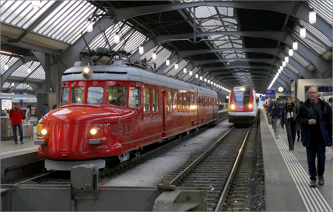 Auch wieder einmal in Lausanne zeigte sich am 12. Mai 2016 der "Rote Pfeil" RAe 4/8 1021 "Churcill-Pfeil".