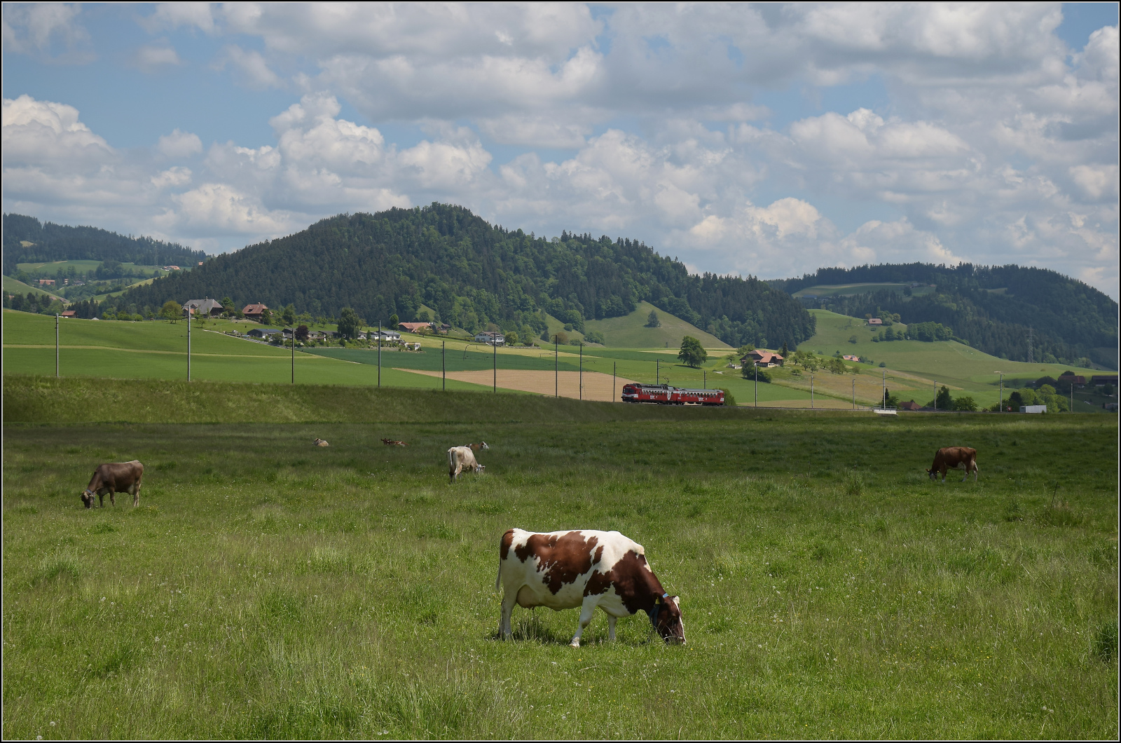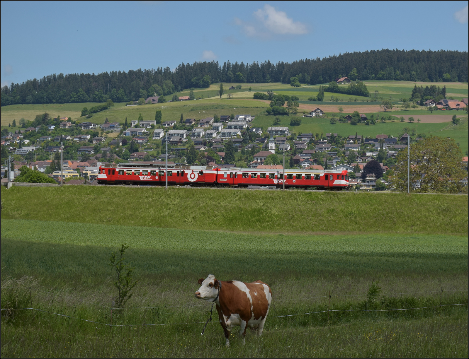 VPM 566 241 steht am 18 Mai 2025 ins Bahnhof von Sümiswald-Grünen und tragt noch die BLS-Farben. Einige Monate zufor hatten die BLS die letzte Triebzüge der Reihe 566 ausgemüsterd und die 566 241 an die VPM geschenckt.