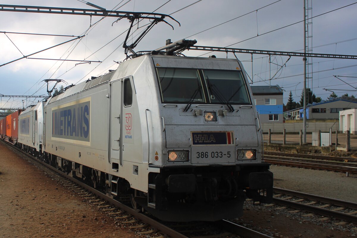 Die HHLA 386 039-2 (91 54 7386 039-2 CZ-MT) der METRANS Rail s.r.o. (Prag / Praha) kommt am 07.12.2022 aus südlicher Richtung (aus Tschechien), auf der auf der Elbtalbahn (KBS 247), mit einem Containerzug und fährt durch Dresden-Strehlen in nördlicher Richtung (vermutlich nach Hamburg). Die METRANS gibt es schon über 30 Jahren, sie ist ein 100 %-iges Tochterunternehmen der Hamburger Hafen und Logistik AG (HHLA).